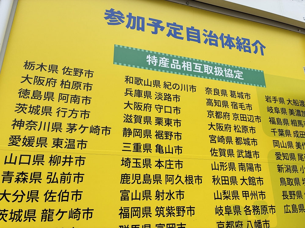 その中心となるのが「全国物産館 まるかじりJAPAN」です。 阿南市は、泉佐野市と『特産品相互取扱協定』を結んでいることから、このイベントに参加させていただきました。雨の中、開店前から多くのお客様が並んでいただき、なんと二日目のお昼すぎには、たけのこメンマ、柑橘シロップなど商品がすべて完売となりました。2日連続ご購入いただいたお客様もいらして、感謝です!