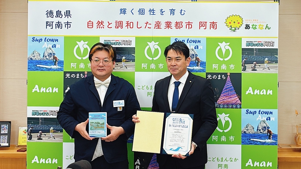 海と深く関わりを持つ「日本」の海にまつわる民話を発掘し、その民話に込められた「思い」「警鐘」「教訓」を親しみやすいアニメーションで表現したものです。今回、阿南市に伝わる民話『手島若宮神社のご神体』のアニメが完成し、監督の沼田心之助さんと実行委員会の皆さんが阿南市の岩佐市長のもとを訪れ、「海の民話のまち」認定証とDVDを贈呈し、アニメが上映されました。岩佐市長は、「いただいたDVDを活用しながら、郷土愛の醸成につなげていきたい」と話していました。