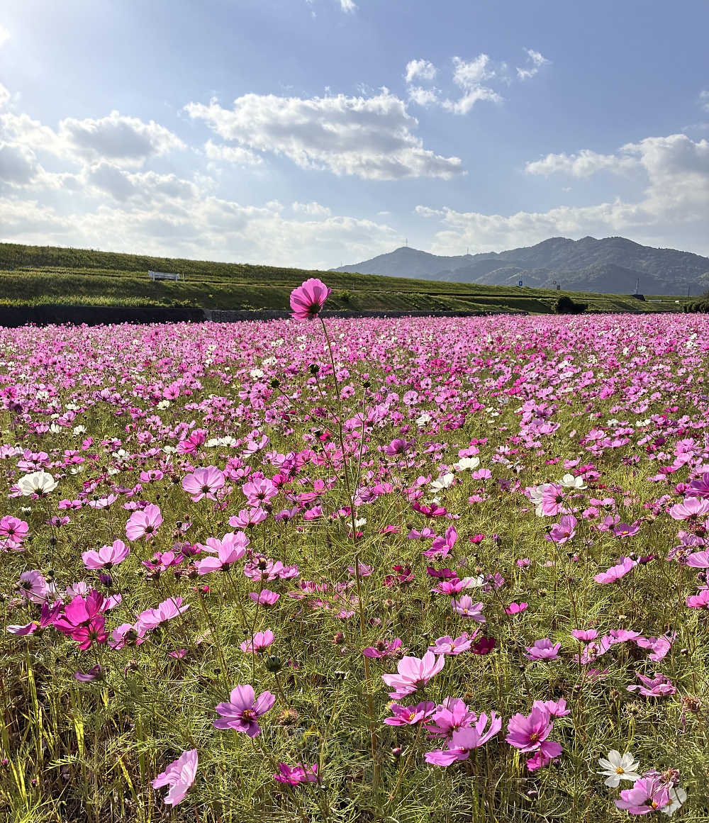 今、満開のピークを迎えている那賀川北岸 古毛地区のコスモス畑です。風にゆらゆら揺れて、見渡す限りのコスモスが本当に美しかったです。この地区では、お米の収穫が終わった8月3日に18人で種まきをしたそうです。