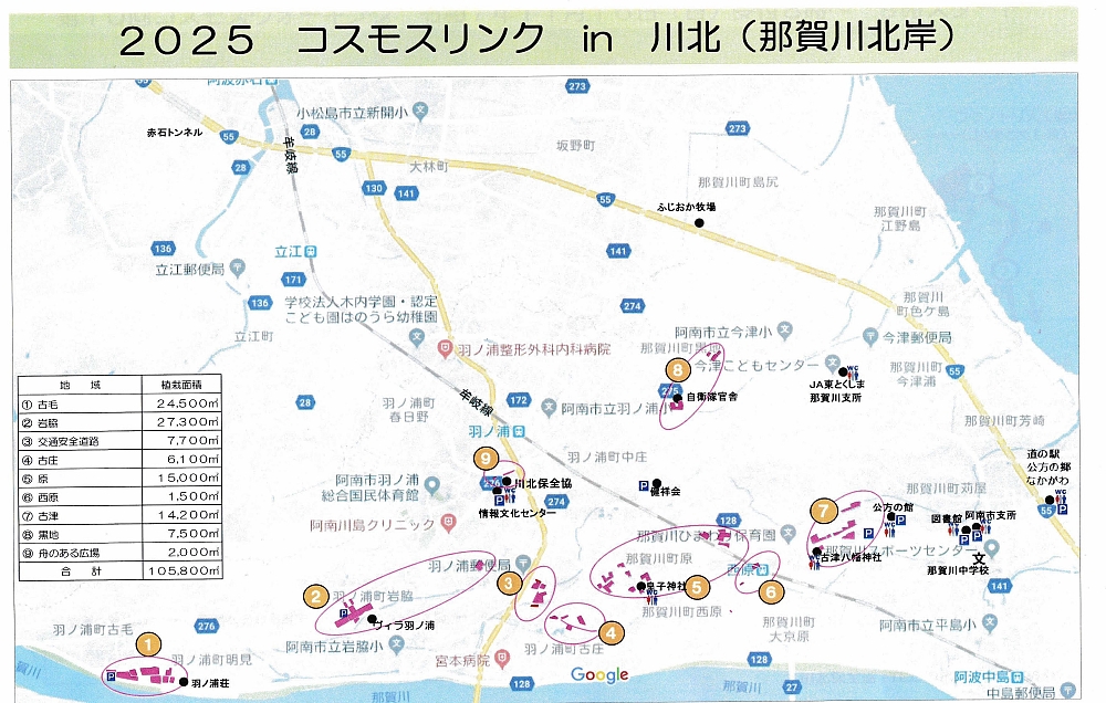 地図が少し小さいですが、オレンジの白抜き数字1が古毛地区です。駐車場もありますので、ゆっくりコスモスを楽しめますよ。そのほかの地区もほぼ見頃近しか、見頃を迎えています。