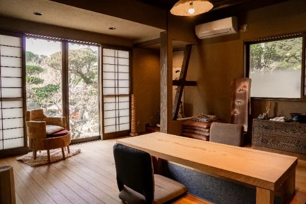 徳島県阿南市椿町にある最大5人から8人まで宿泊可能な貸別荘です。広いリビングに75インチTV。